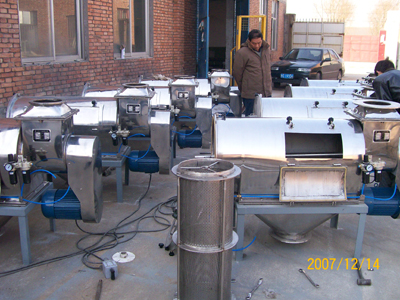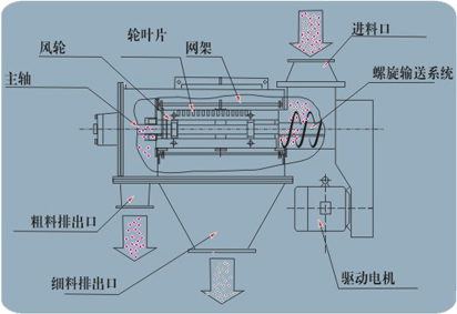本設(shè)備篩網(wǎng)為圓筒狀,置于機(jī)體內(nèi),物料通過螺旋輸送系統(tǒng)后,和氣流混合、霧化進(jìn)入網(wǎng)筒內(nèi);通過網(wǎng)筒內(nèi)風(fēng)輪葉片使物料同時(shí)受離心力和旋風(fēng)推進(jìn)力,從而迫使物料噴射過網(wǎng),由細(xì)料排出口排出,不能過網(wǎng)的物料沿筒壁從粗料排出口排出。